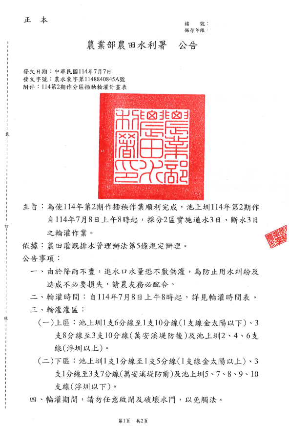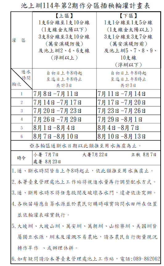 主旨:為使114年第2期作插秧作業順利完成,池上圳114年第2期作自114年7月8日上午8時起,採分2區實施通水3日、斷水3日之輪灌作業。