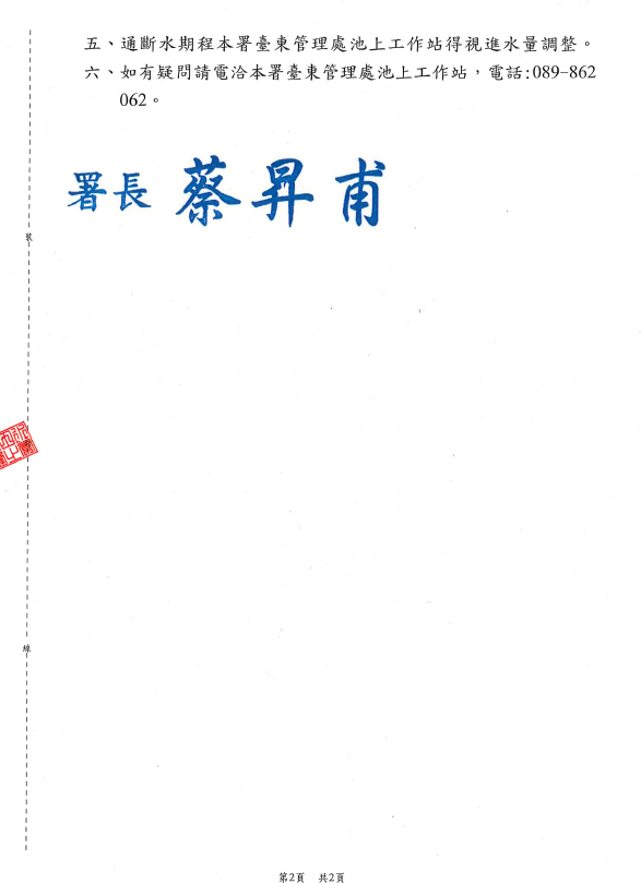 五、通斷水期程本署臺東管理處池上工作站得視進水量調整。
