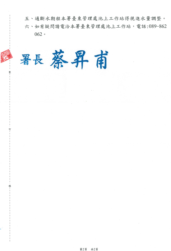五、通斷水期程本署臺東管理處池上工作站得視進水量調整。