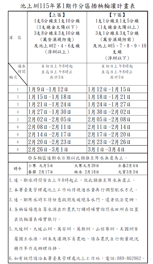 主旨:為使115年第1期作插秧作業順利完成,池上圳115年第1期作自115年1月9日8時起,採分2區實施通水3日、斷水3日之輪灌作業。