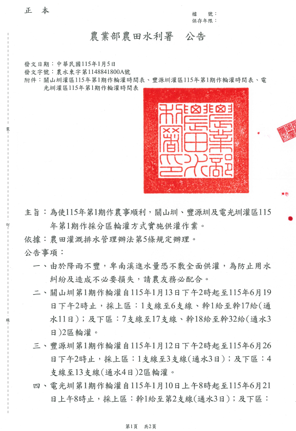 主旨:為使115年第1期作農事順利,關山圳、豐源圳及電光圳灌區115年第1期作採分區輪灌方式實施供灌作業。