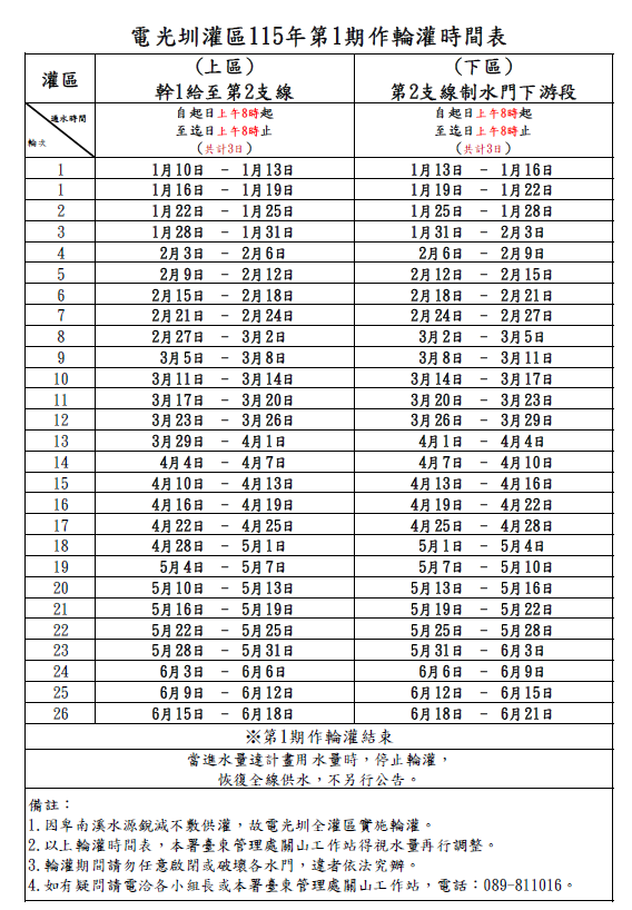 四、電光圳第1期作輪灌自115年1月10日上午8時起至115年6月21日上午8時止,採上區:幹1給至第2支線(通水3日);及下區:第2支線制水門下游段(通水3日)2區輪灌。