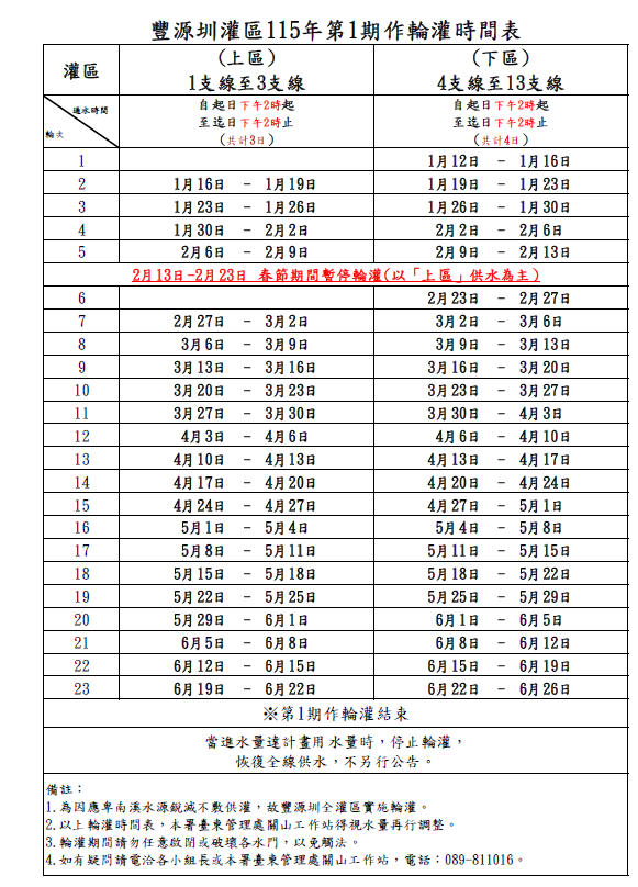 三、豐源圳第1期作輪灌自115年1月12日下午2時起至115年6月26日下午2時止,採上區:1支線至3支線(通水3日);及下區:4支線至13支線(通水4日)2區輪灌。