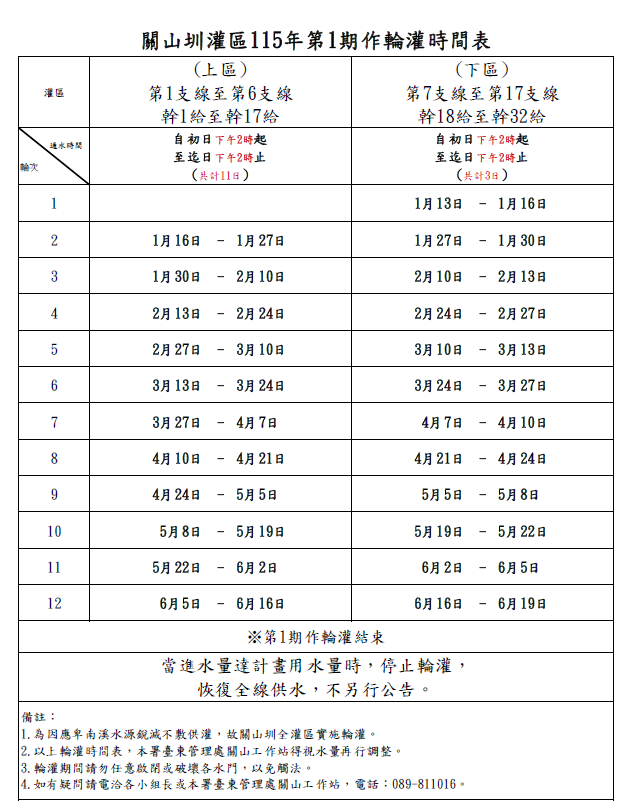 二、關山圳第1期作輪灌自115年1月13日下午2時起至115年6月19日下午2時止,採上區:1支線至6支線、幹1給至幹17給(通水11日);及下區:7支線至17支線、幹18給至幹32給(通水3日)2區輪灌。