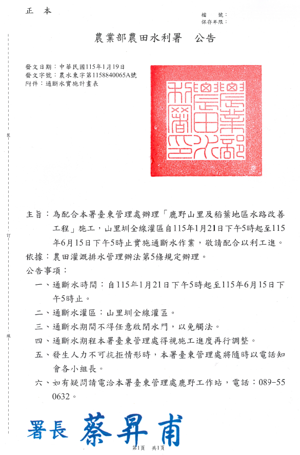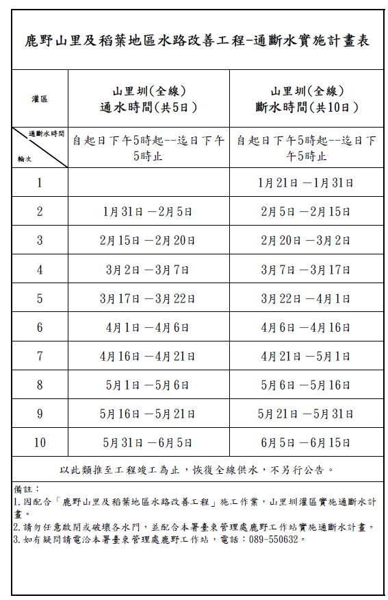 主旨:為配合本署臺東管理處辦理「鹿野山里及稻葉地區水路改善工程」施工,山里圳全線灌區自115年1月21日下午5時起至115年6月15日下午5時止實施通斷水作業,敬請配合以利工進。