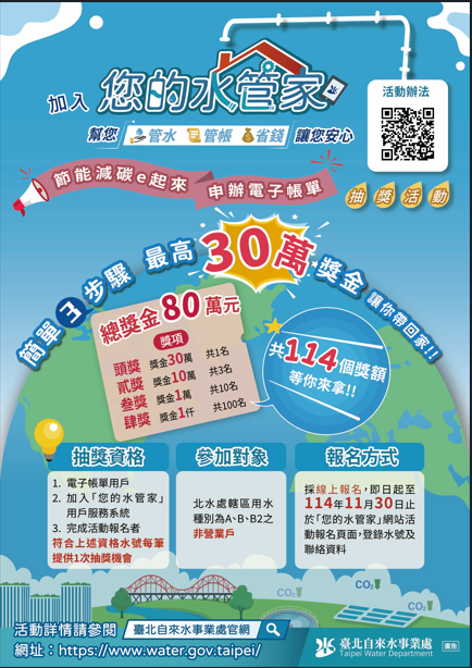 臺北自來水事業處為推動節能減碳政策辦理「節能減碳e起來-申辦水費電子帳單」抽獎活動