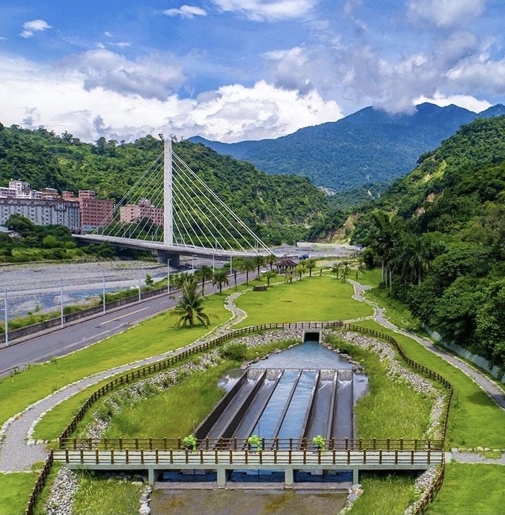 介紹 沉砂池採「洄游」意象設計,外觀以塊石排列,內部以沉砂池作為魚身骨幹,魚頭朝水源處,象徵飲水思源之意,並由現地取得與沉砂池形狀相似之塊石作為出入口意象。親水公園串連當地休憩景點及溫泉風景區觀光景點,形成觀光旅遊網,增加觀光效益,發揮工程附加價值。 交通資訊
