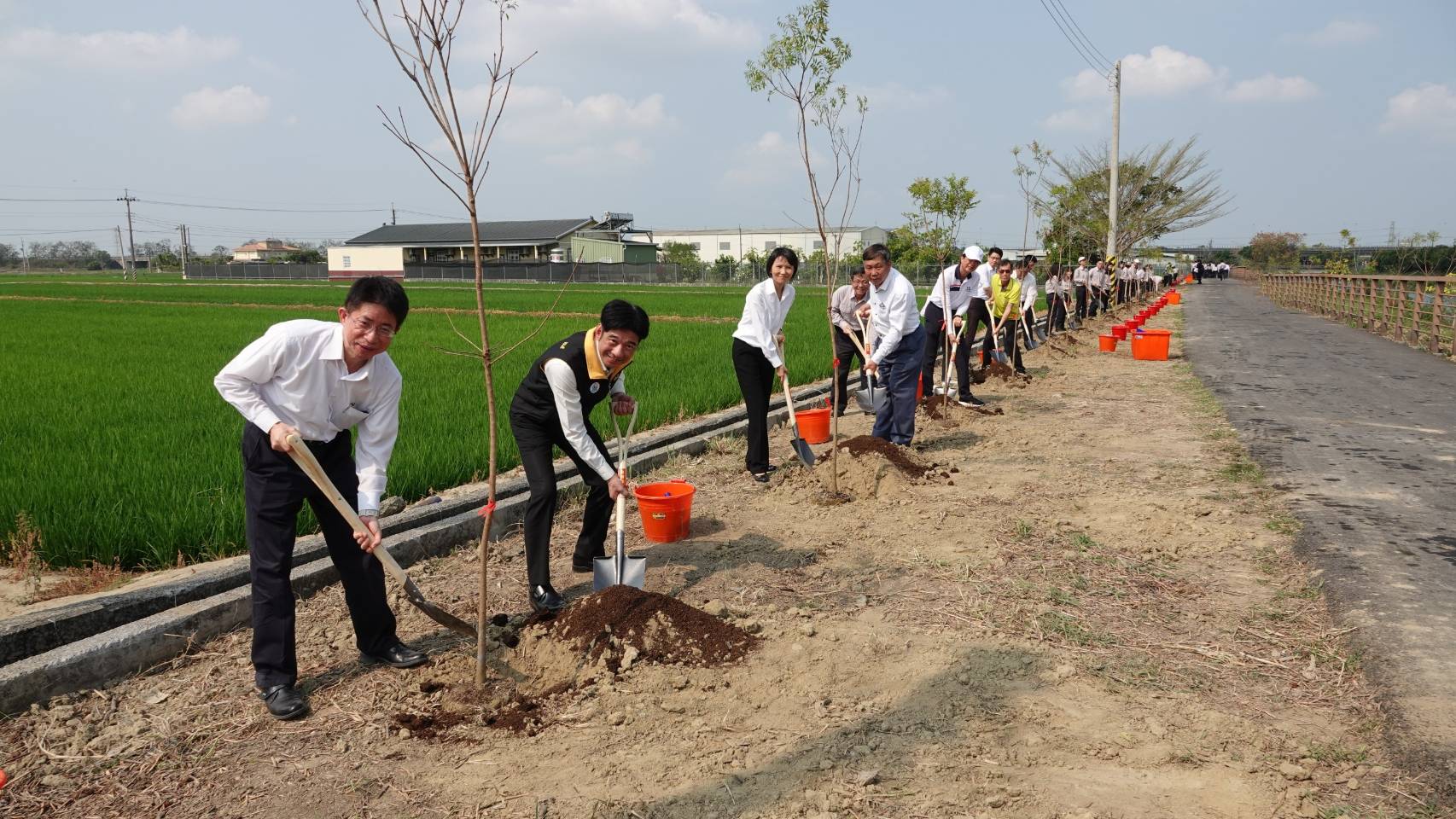 農田水利署今 (113)年辦理水圳綠道持續植生優化工程,持續營造水圳植生綠廊,又結合農業淨零排放政策,推動農業永續ESG專案,今年度媒合奇美實業申辦嘉南大圳-水圳綠道植樹養護計畫,於植樹節前夕辦理植樹活動,以具體行動落實農業永續 ESG,署長蔡昇甫今(6)日偕同奇美實業副總經理陳世賢等52名員工,於嘉南大圳導水路旁共同參與植樹活動,營造大圳成為碳匯綠廊,為百年圳路再生風華,也為全球淨零減碳盡一份心力。