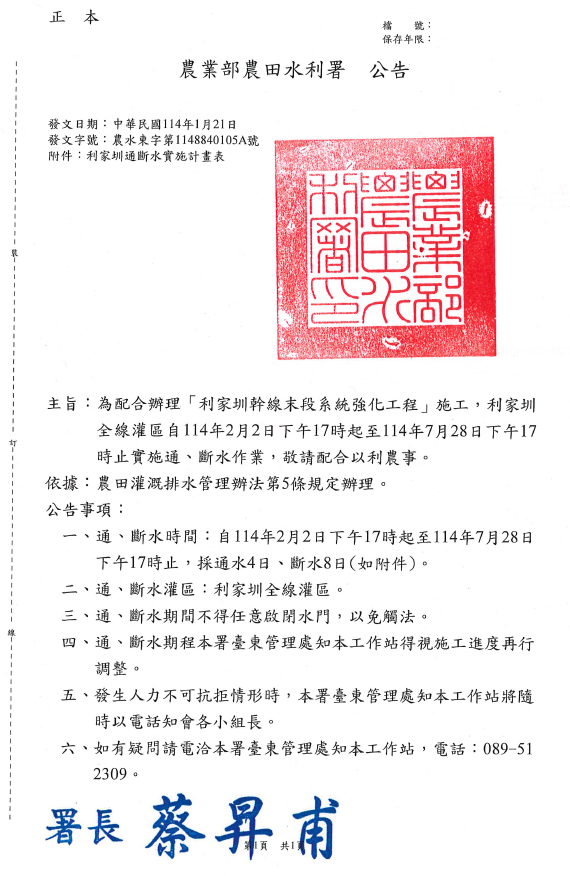 主旨:為配合辦理「利家圳幹線末段系統強化工程」施工,利家圳全線灌區自114年2月2日下午17時起至114年7月28日下午17時止實施通、斷水作業,敬請配合以利農事。
