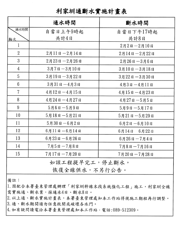 四、通、斷水期程本署臺東管理處知本工作站得視施工進度再行調整。