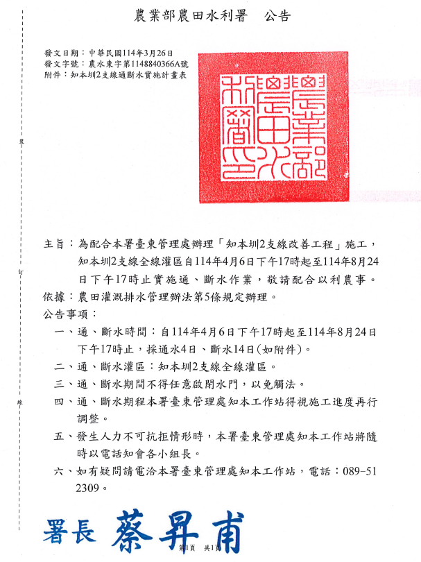 主旨:為配合本署臺東管理處辦理「知本圳2支線改善工程」施工,知本圳2支線全線灌區自114年4月6日下午17時起至114年8月24日下午17時止實施通、斷水作業,敬請配合以利農事。