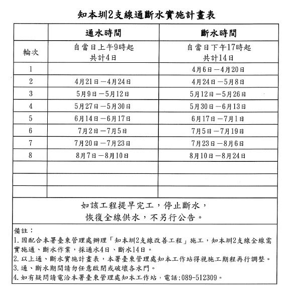 四、通、斷水期程本署臺東管理處知本工作站得視施工進度再行調整。