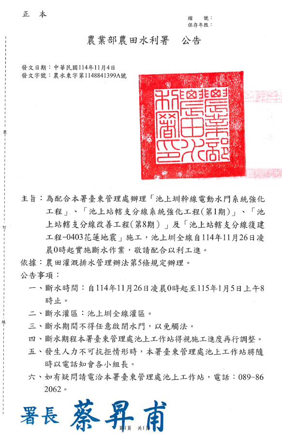 主旨:為配合本署臺東管理處辦理「池上圳幹線電動水門系統強化工程」、「池上站轄支分線系統強化工程(第1期)」、「池上站轄支分線改善工程(第8期)」及「池上站轄支分線復建工程-0403花蓮地震」施工,池上圳全線自114年11月26日凌晨0時起實施斷水作業,敬請配合以利工進。
