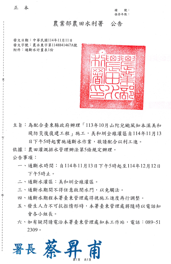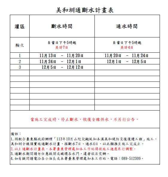 主旨:為配合臺東縣政府辦理「113年10月山陀兒颱風知本溪美和堤防災後復建工程」施工,美和圳全線灌區自114年11月13日下午5時起實施通斷水作業,敬請配合以利工進。