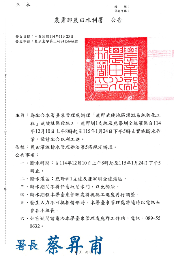 主旨:為配合本署臺東管理處辦理「鹿野武陵地區灌溉系統強化工程」武陵社區段施工,鹿野圳1支線及鹿寮圳全線灌區自114 年12月10日上午8時起至115年1月24日下午5時止實施斷水作業,敬請配合以利工進。