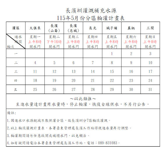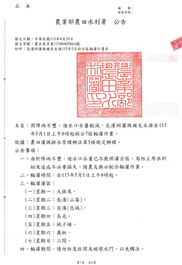 主旨:因降雨不豐,進水口水量銳減,長濱圳灌溉補充水源自115年4月20日上午8時起採分7區輪灌作業。