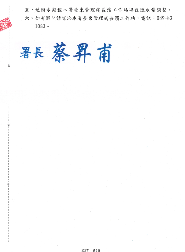 五、通斷水期程本署臺東管理處長濱工作站得視進水量調整。