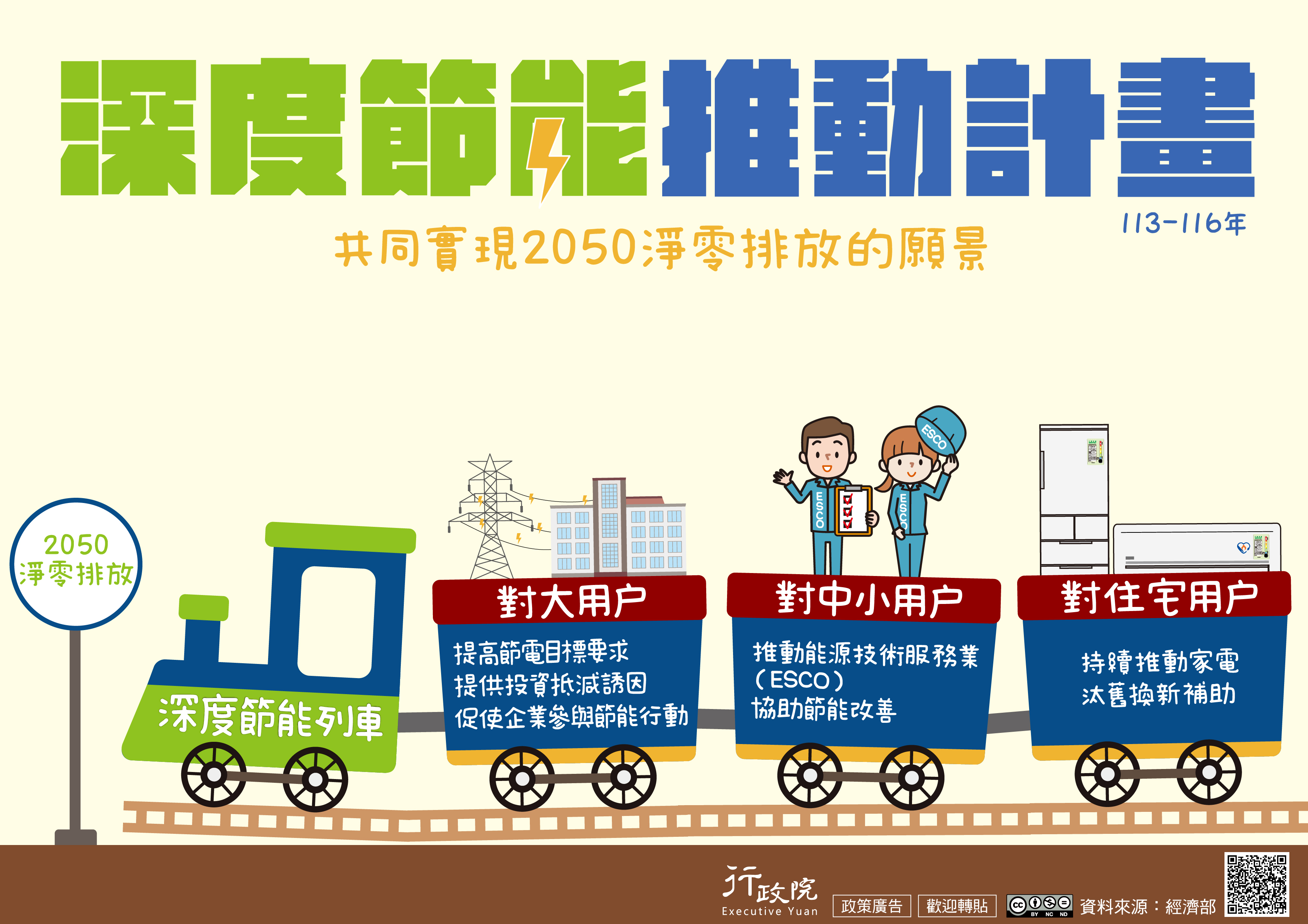 為提升能源自主,強化國家及企業韌性,政府推動深度節能計畫,針對大用戶、中小用戶及家庭用戶規劃節電措施,期藉由與產業、民間攜手合作節能,提高能源使用效率,朝2050淨零排放的目標邁進。
